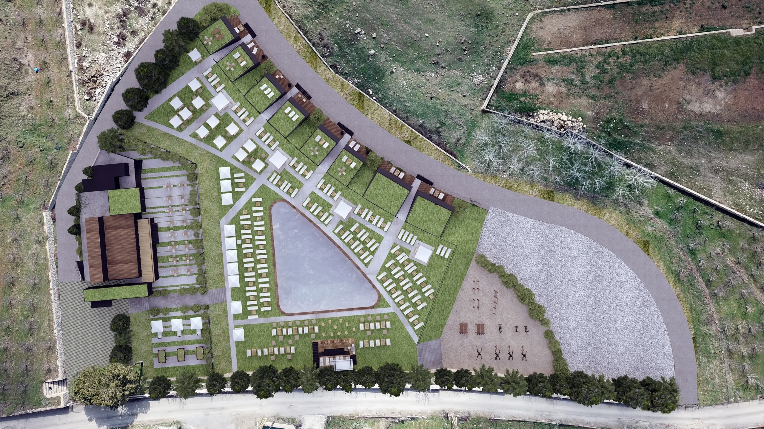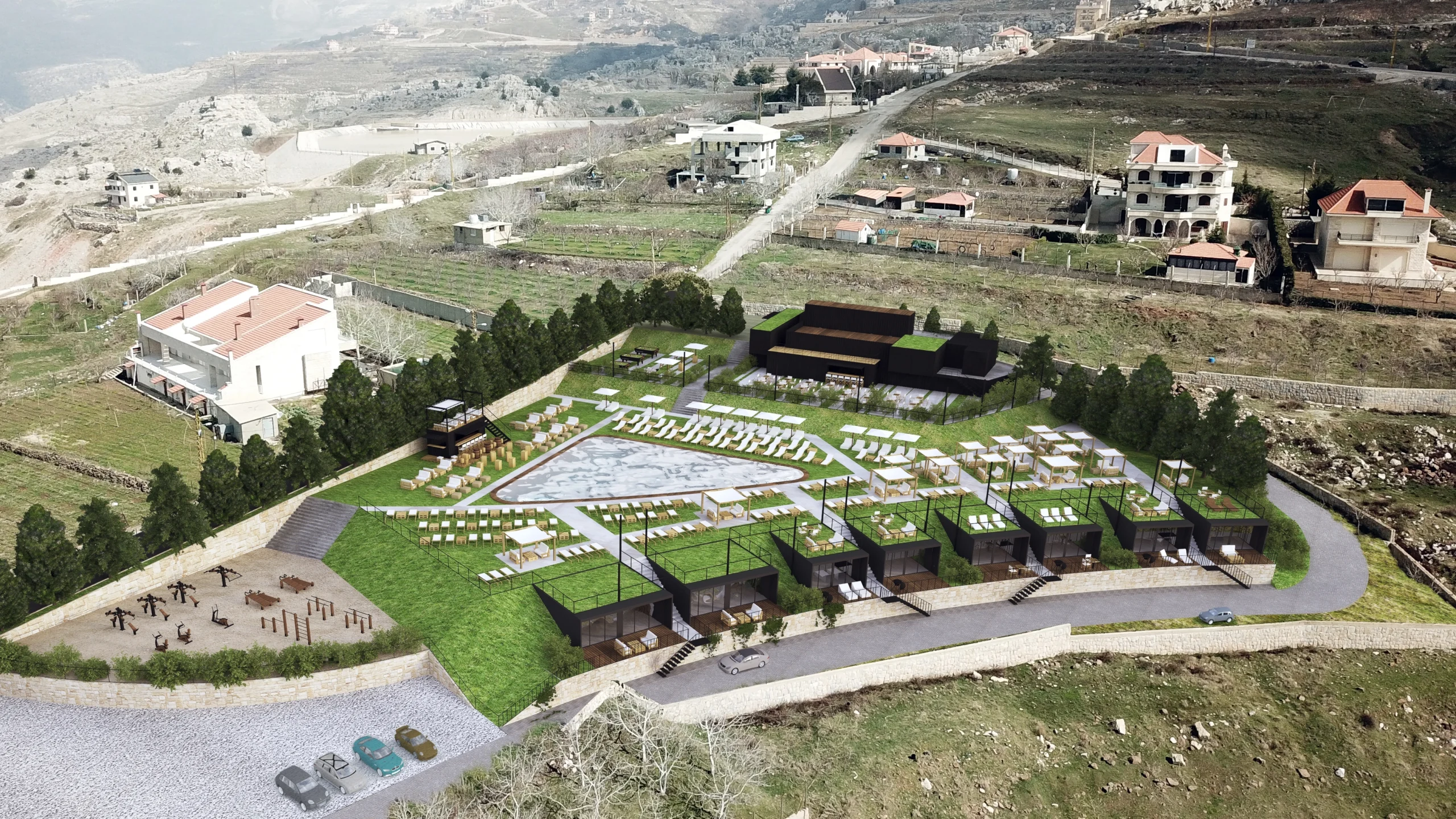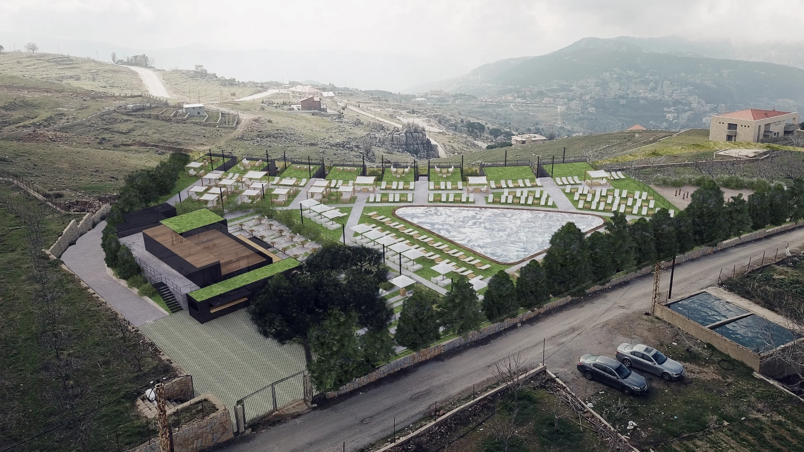 This project is a mixed use development located in Zaarour, a mountainous region of Lebanon, 10 minutes away from Zaarour Club and the ski resort. With a total area of 15,000 sqm, the program consists of a venue area around a central pool and a bungalow hotel. The project was designed on 3 different levels following the land topography, in a way that every level has unobstructed mountain and sea views. Every component has separate access to optimize operation and maximize privacy.