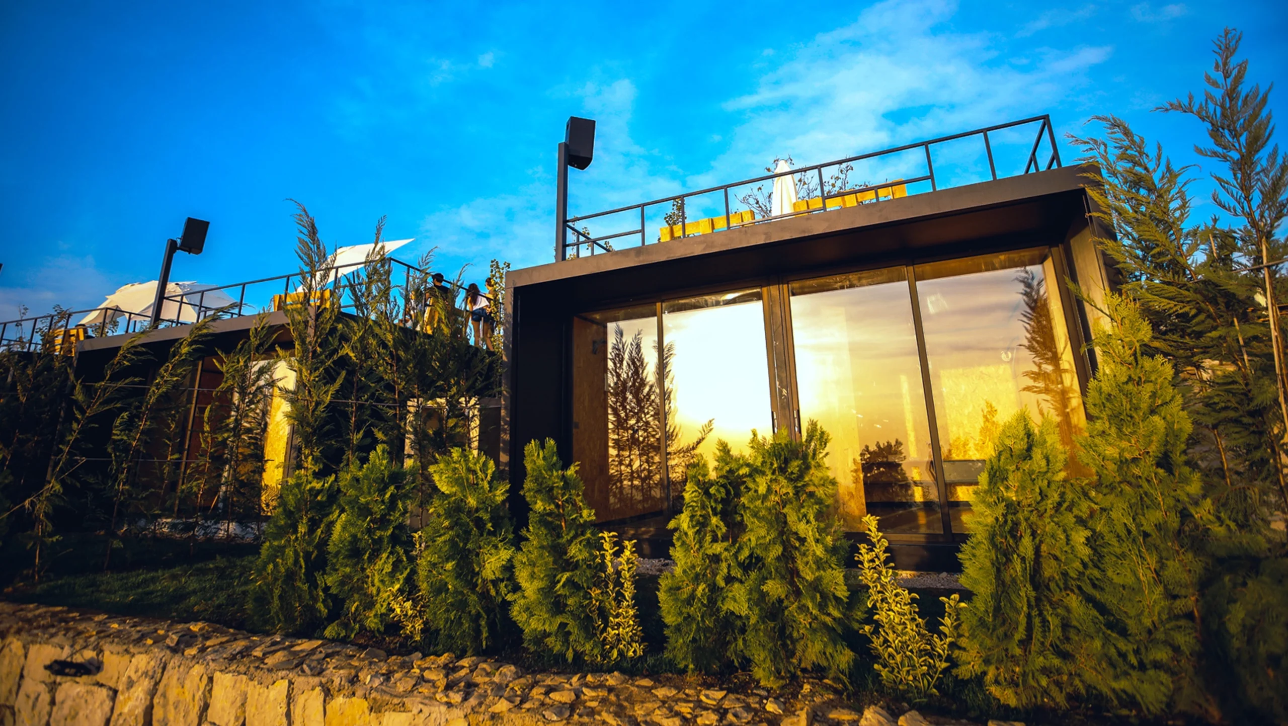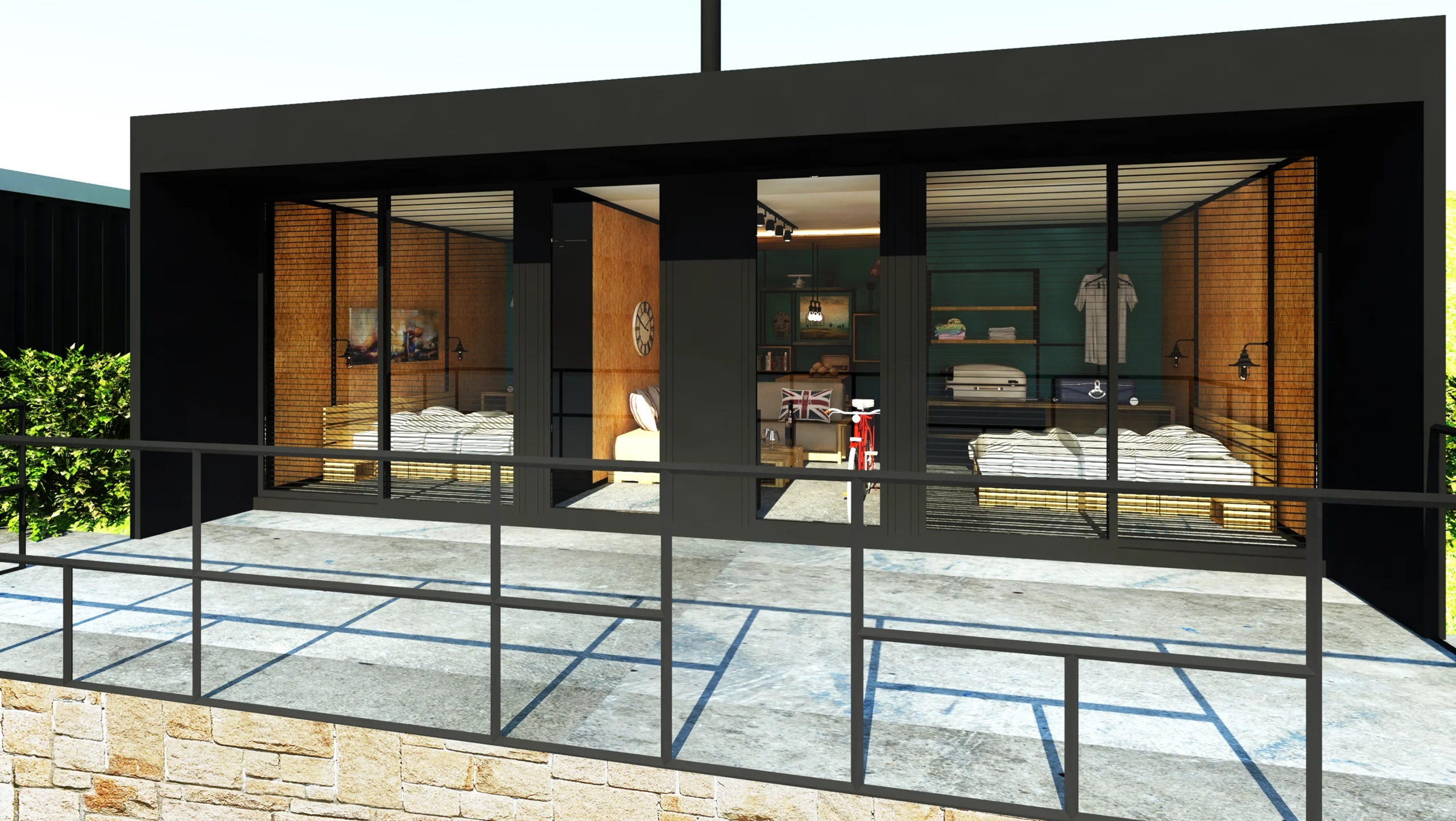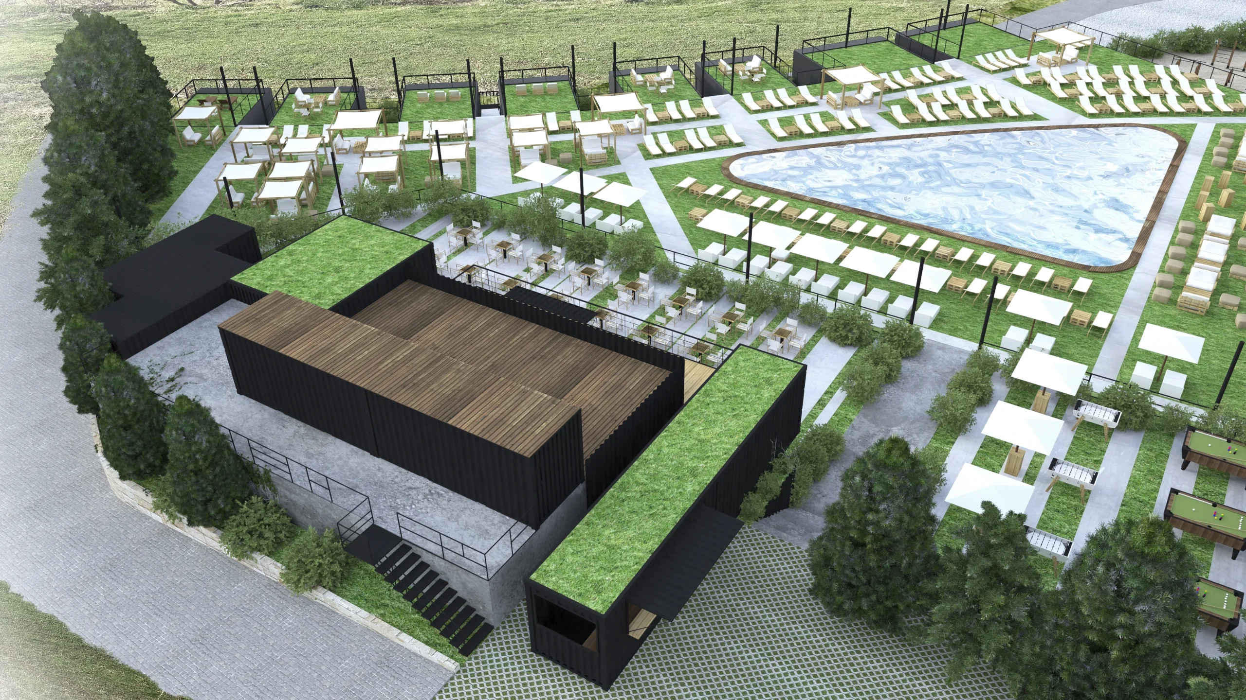 with an extremely challenging timeframe and budget, the project was designed and executed in 5 months, using shipping containers in construction for the volumes and functions and recyclable materials for finishes and furniture.
